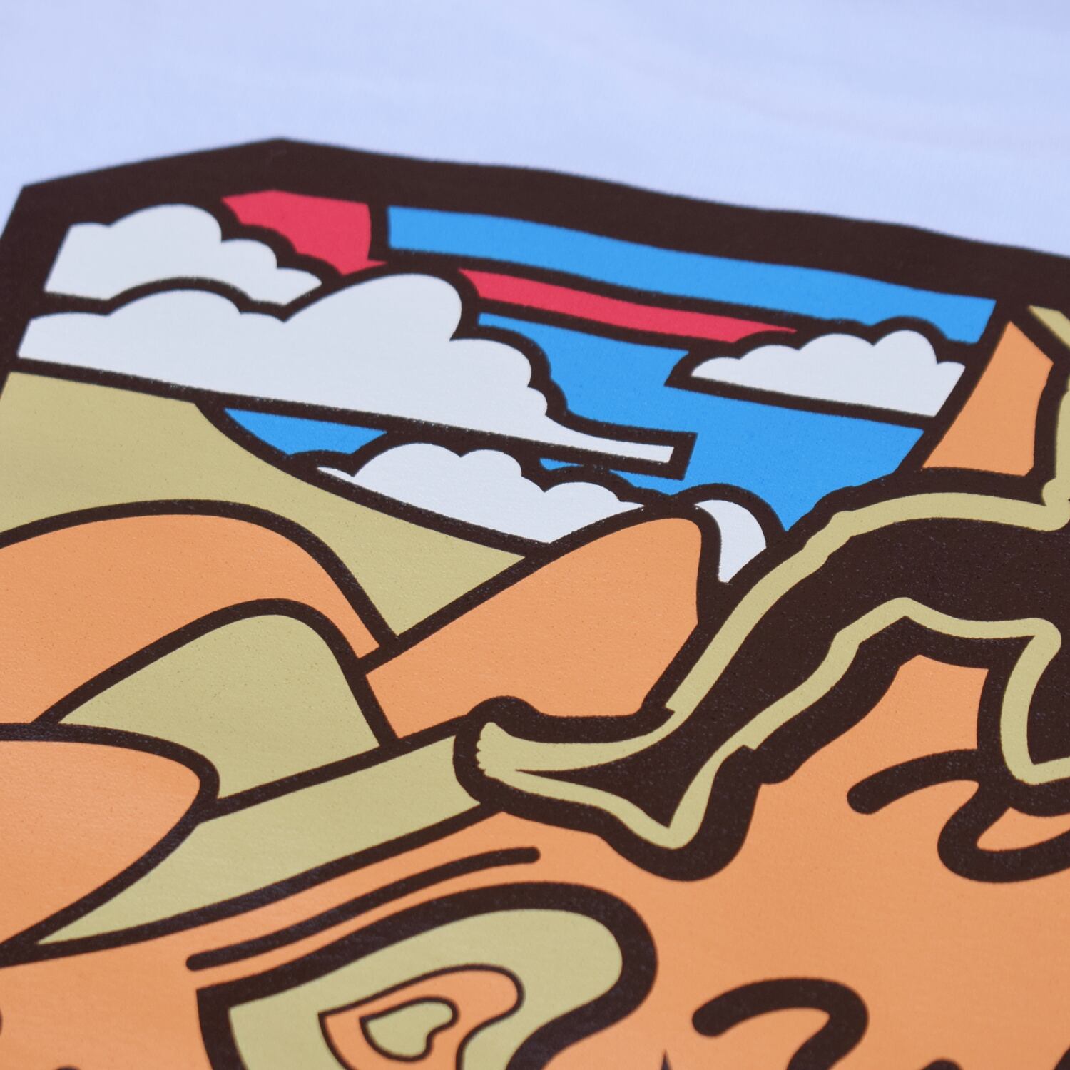 壮大な自然の中でクライミングのムーヴ(技法)の一つであるdropkneeをするクライマーを描いたポップなグラフィック。